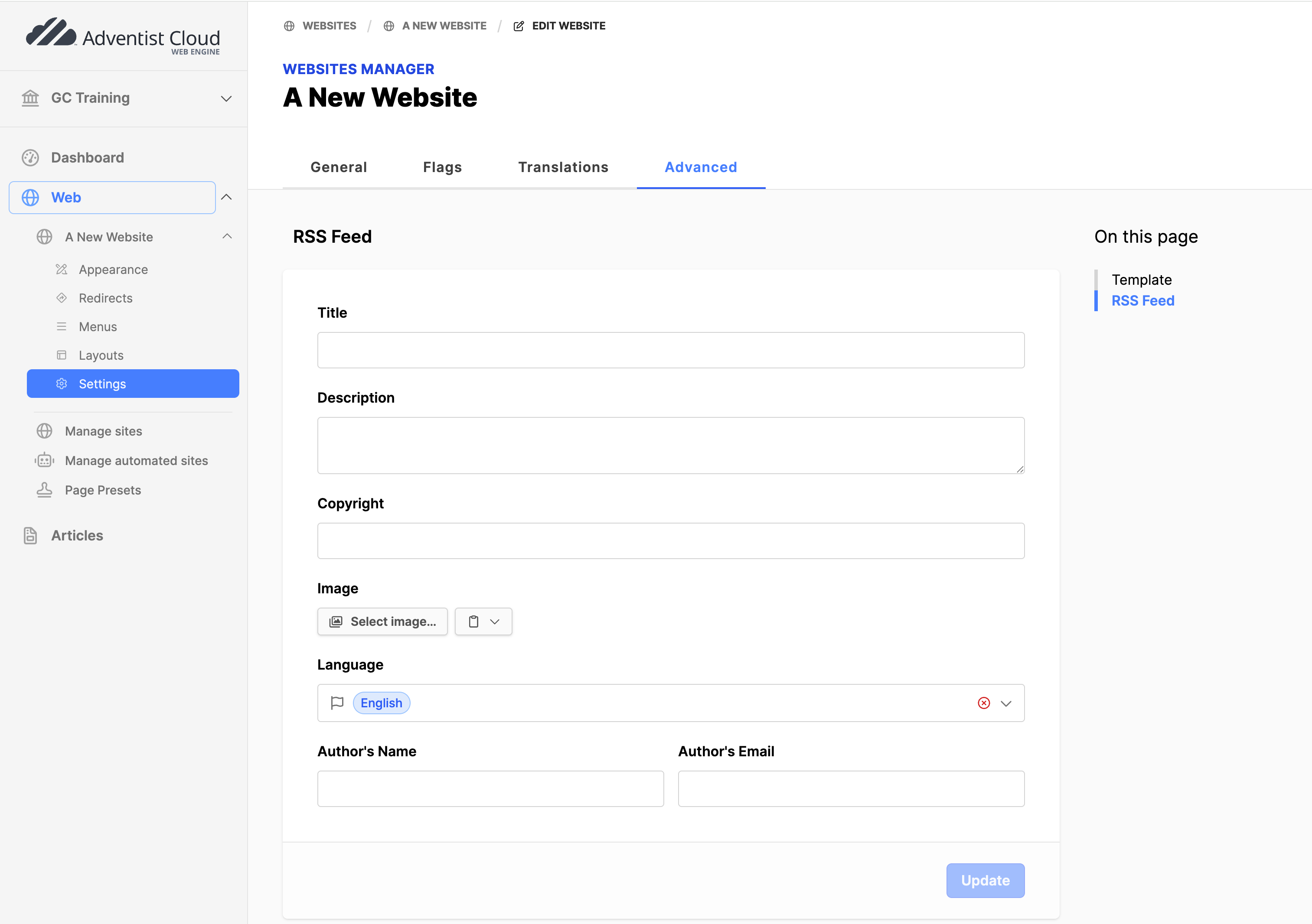 It is possible to configure multiple RSS feeds on the website. If additional RSS feeds are required, additional RSS pages will need to be created. The page name will need to vary for each RSS endpoint created using the steps below.