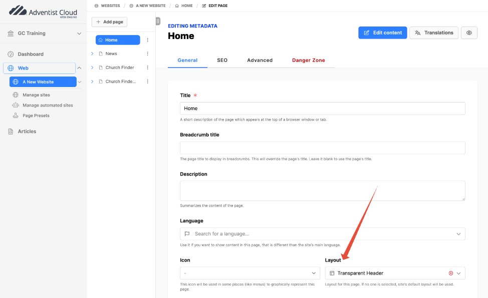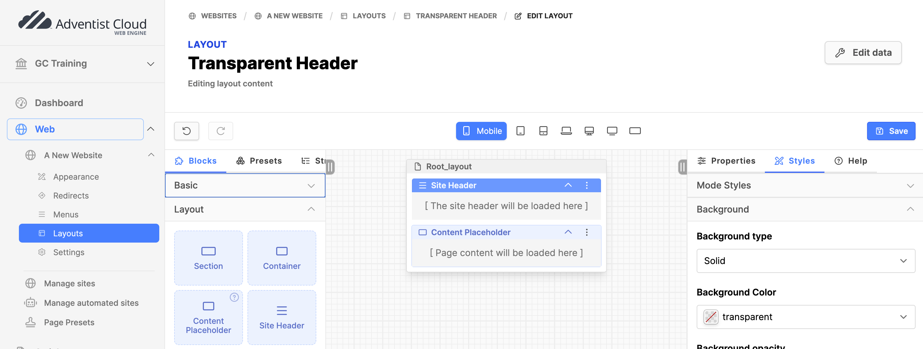 These notes demonstrate how to configure a page (or entire site) to use the transparent header. So that the navigation elements appear on the header background image and not a colored background. Mainly used for the Adventist design.