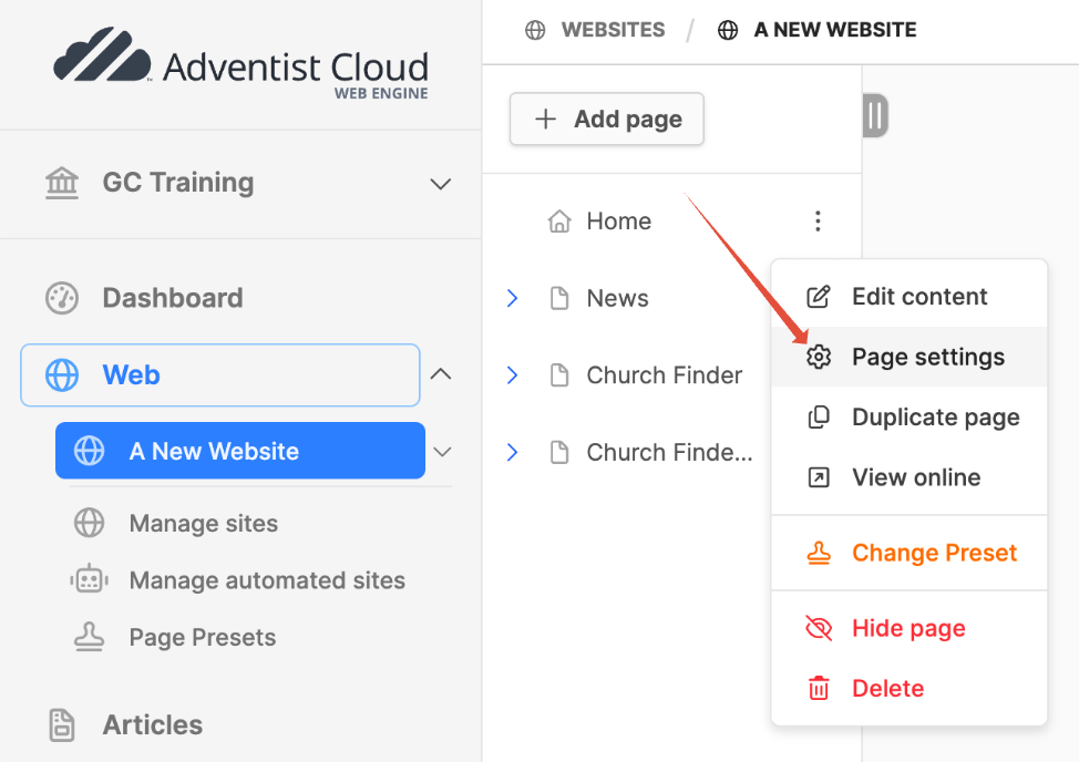 - Choose a page that should have a transparent header, and click on the menu icon (3 dots).