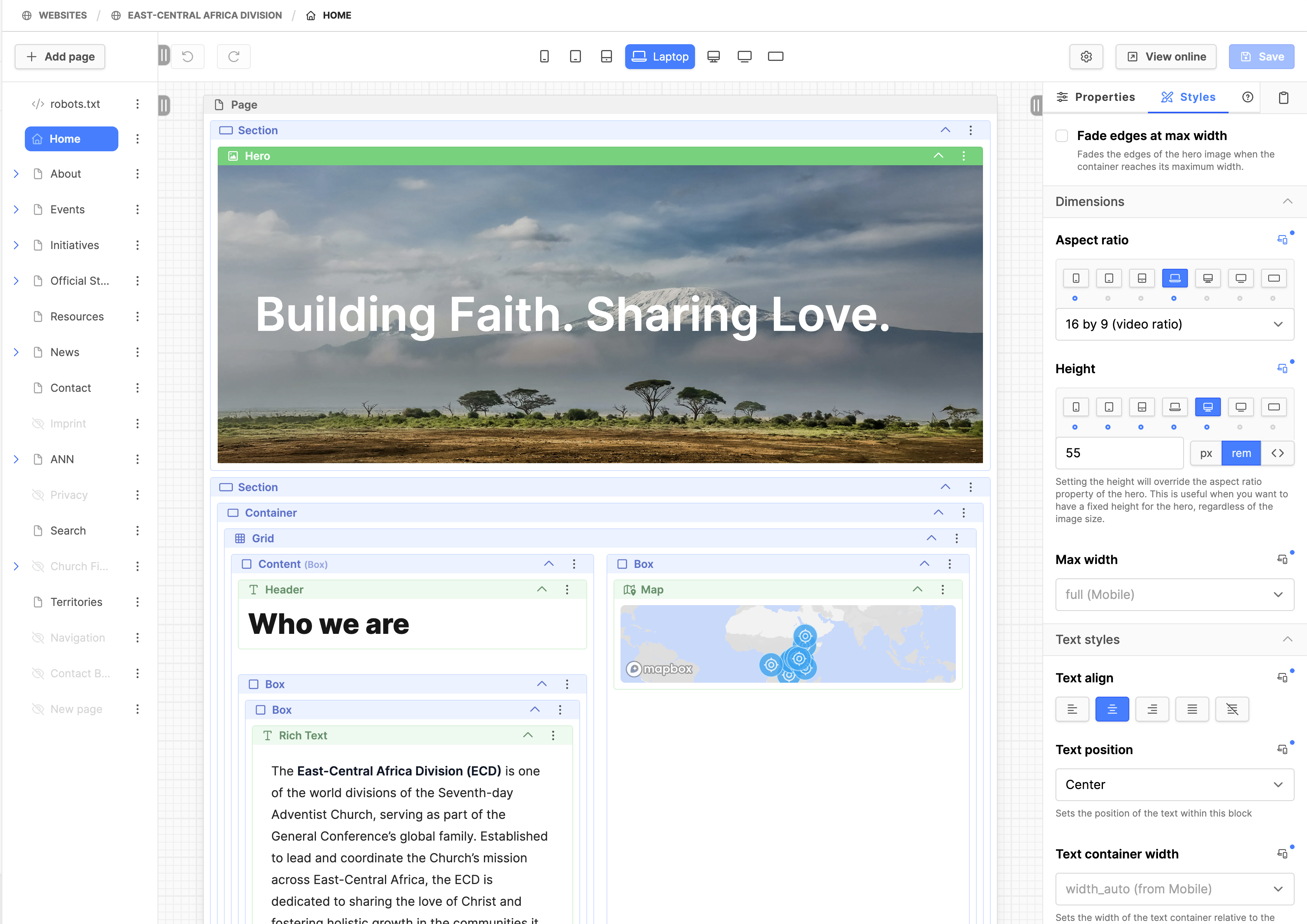 - To the Hero block: add an image, Title, Description text, call to action, as needed.