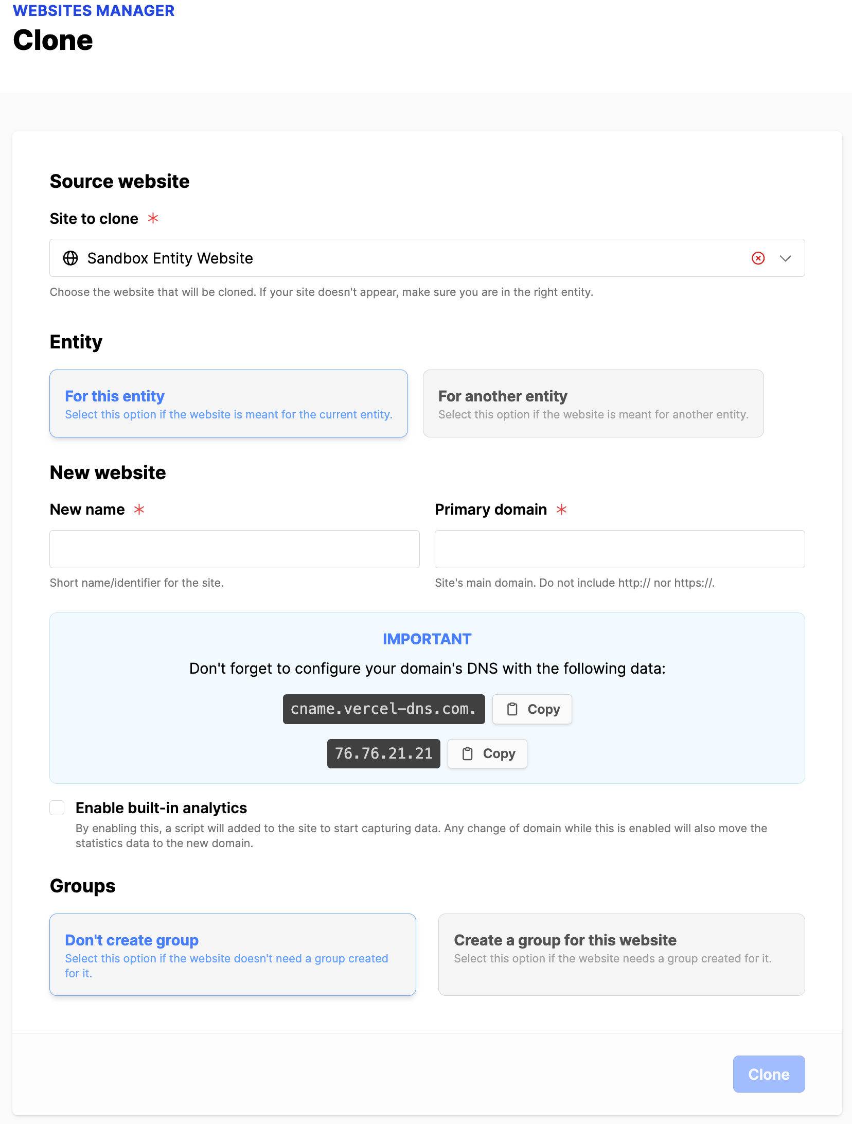 In either case the cloning interface will appear. With the second option, the source website will already be filled in, as the website to clone has already been chosen.