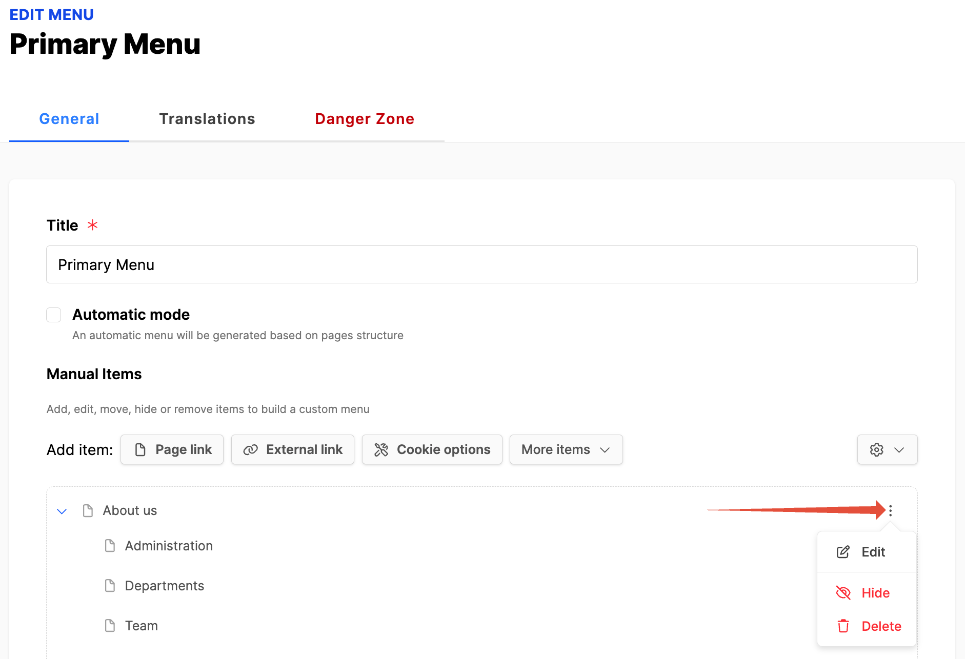 - Click on the three vertical dots to the right of the navigation link to be styled.