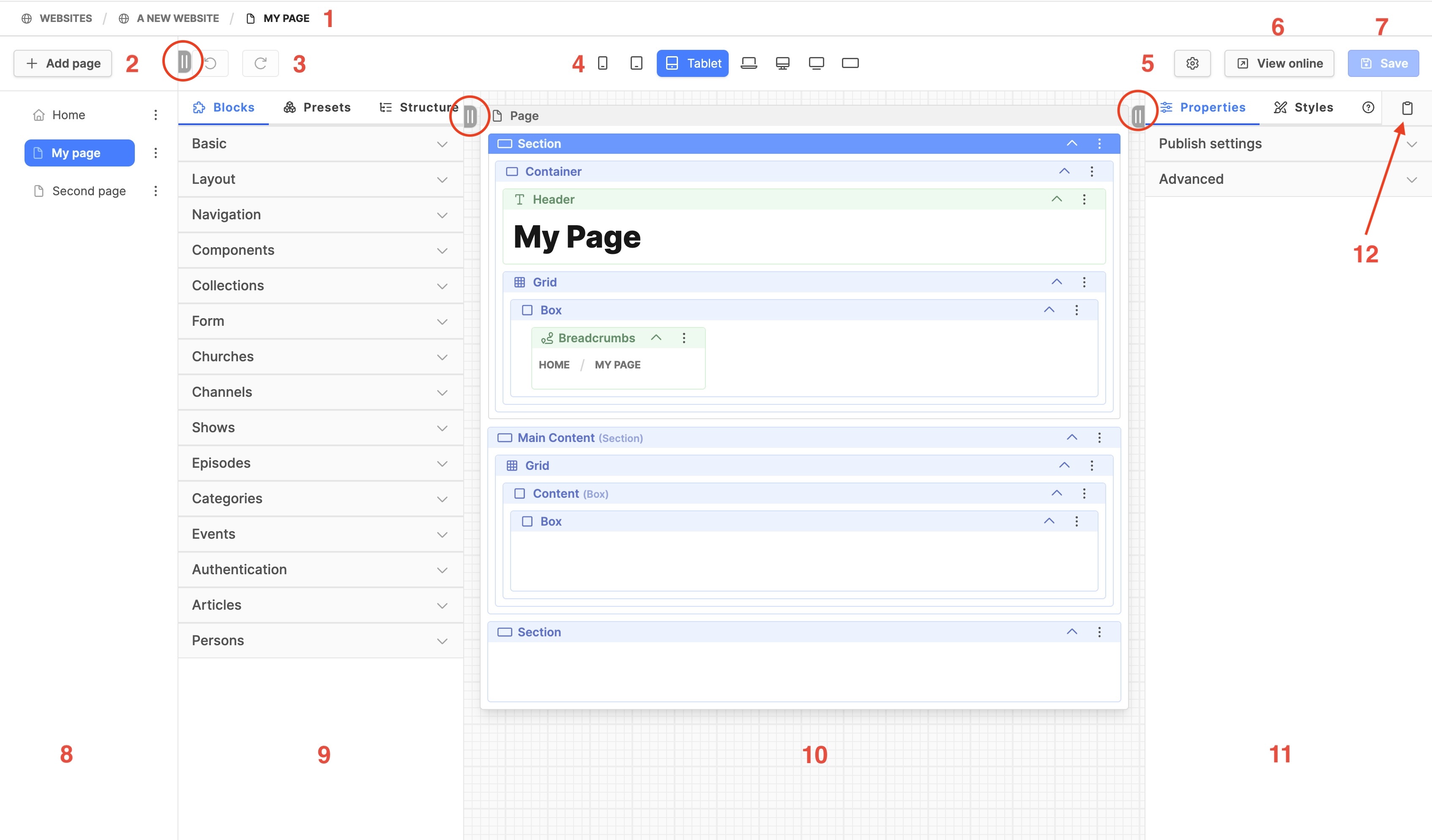 The red circles indicate tabs which can be collapsed to create additional space to work with the Webpage editor interface. Additionally, the border between page tree (8) and frontend blocks panel (9) is adjustable.