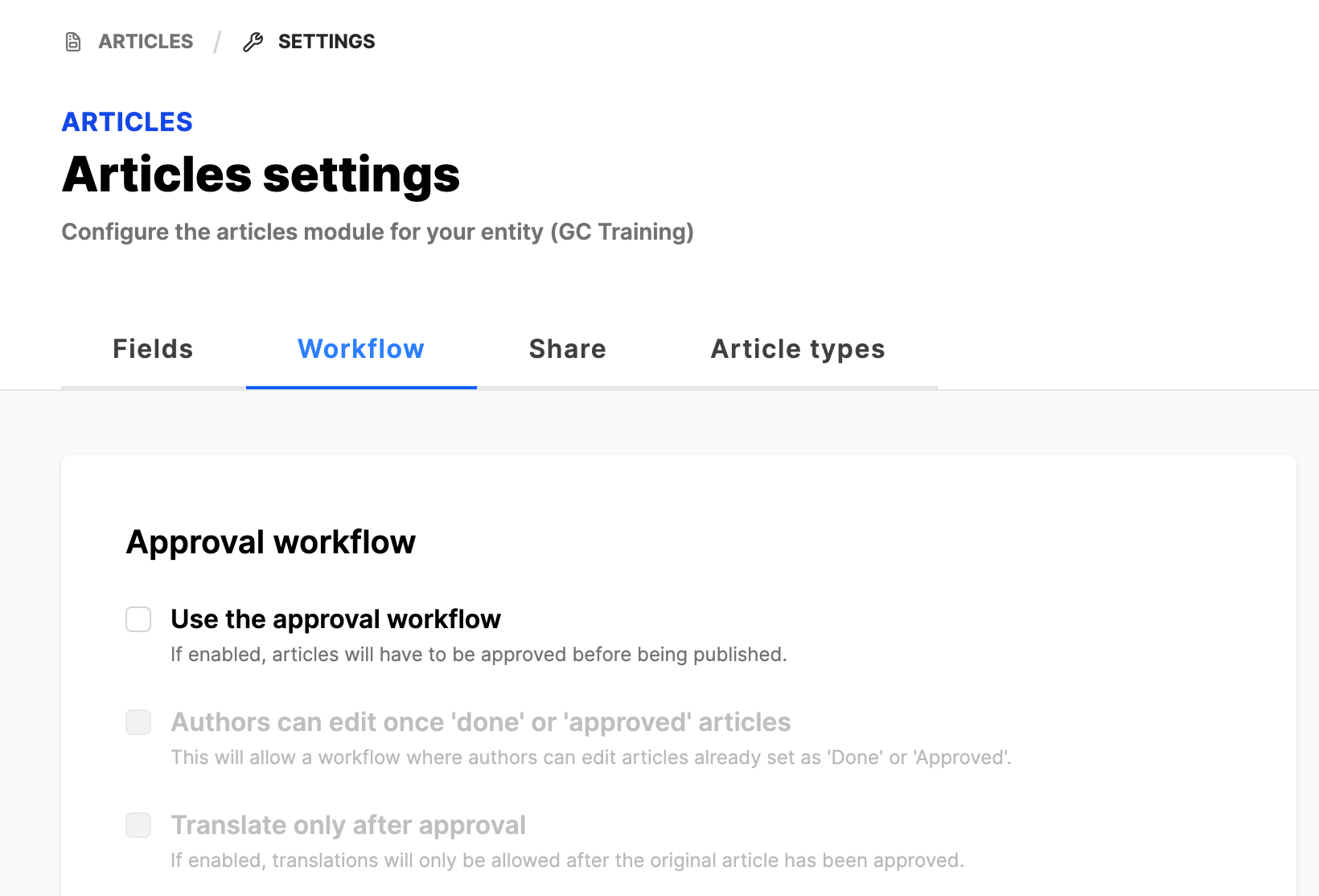 The Articles module offers different workflows depending on the size of the team, or if there is an approval process in place. Consider the following and choose which workflow will serve the needs of your team best.