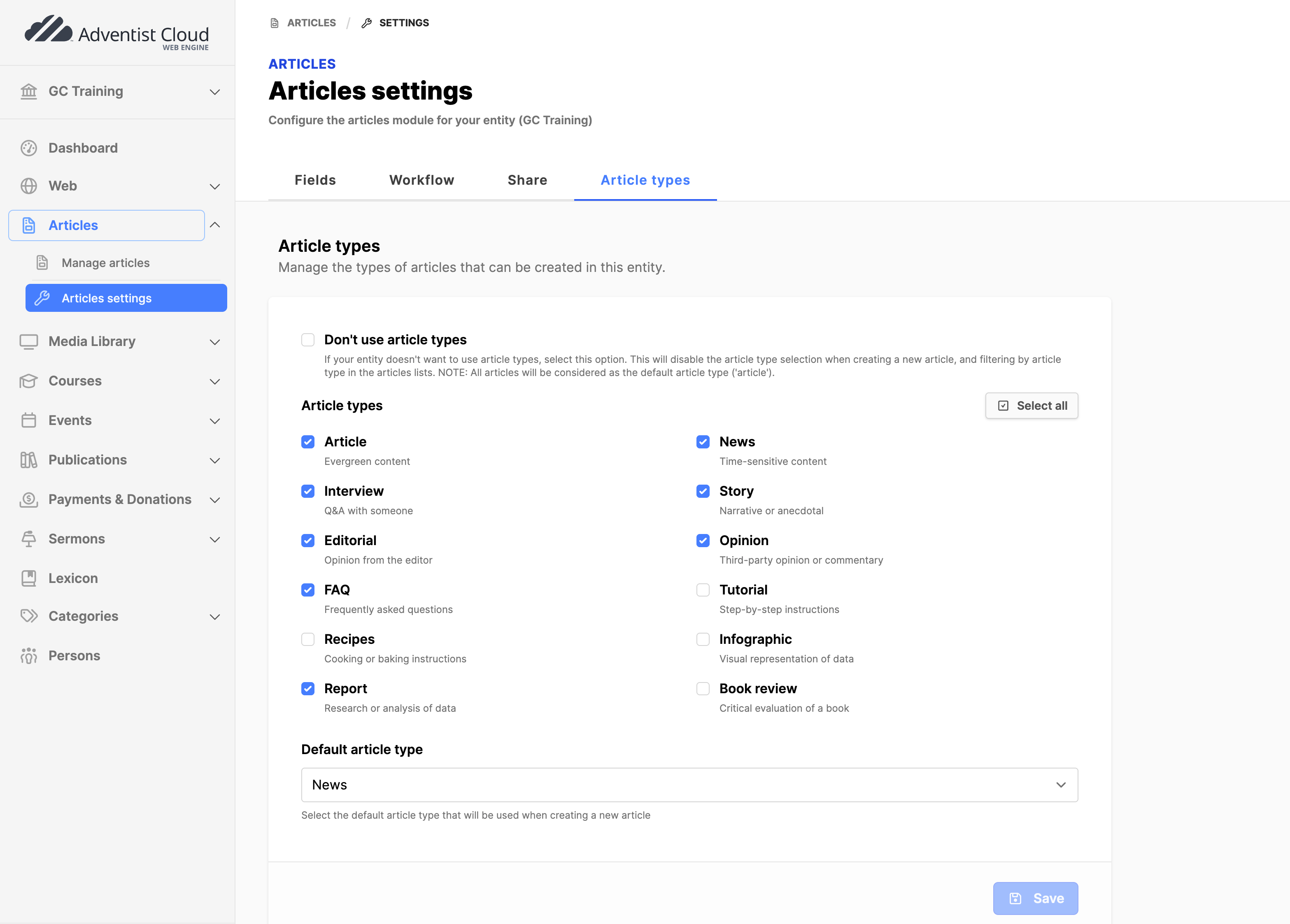 - It is possible not to use article types at all by setting a checkmark in the field.
