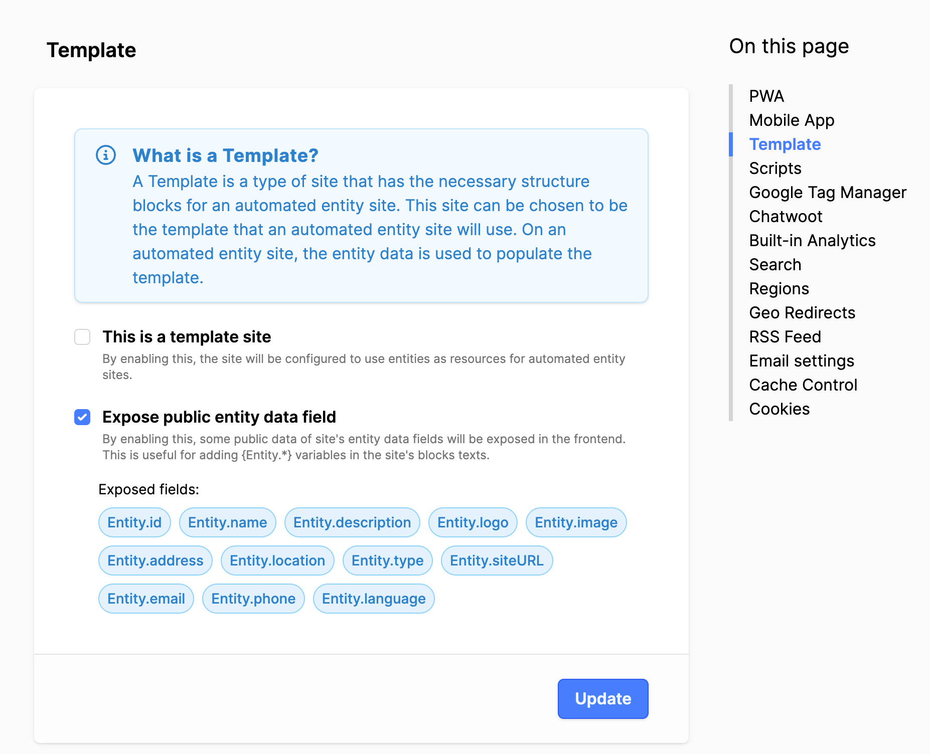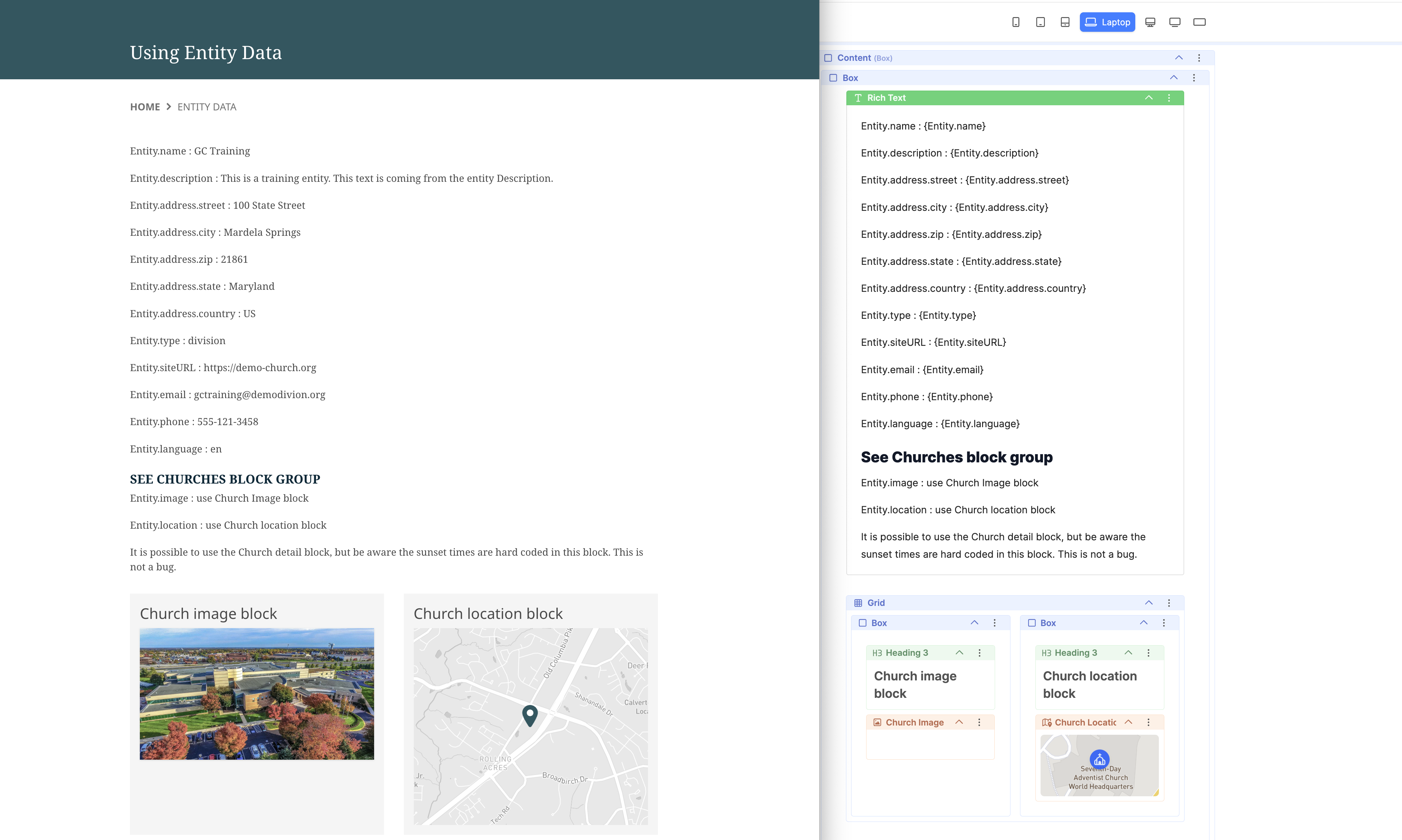 Entity variables can be used in a website or template, to display the entity data in the frontend. This could be used in the case of a local church, where the local church (entity) has no one to support the website, but a it wishes to dynamically display their data on the website. In this case a template is built and the local church is mapped to use that website template. Then in the frontend, the church data appears on the website (template).