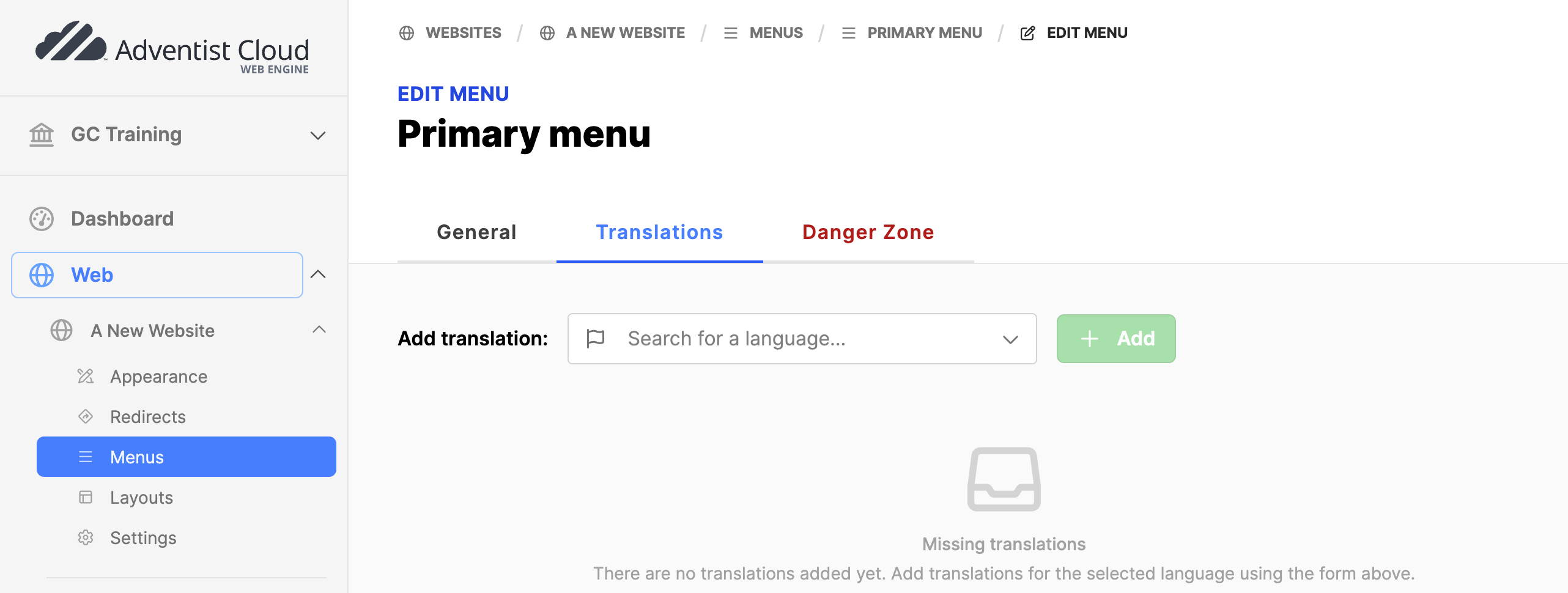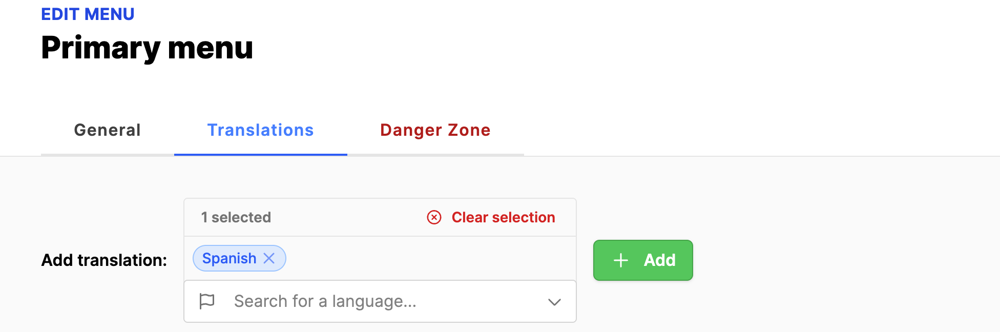 - Click on the green Add button to add the language to the website