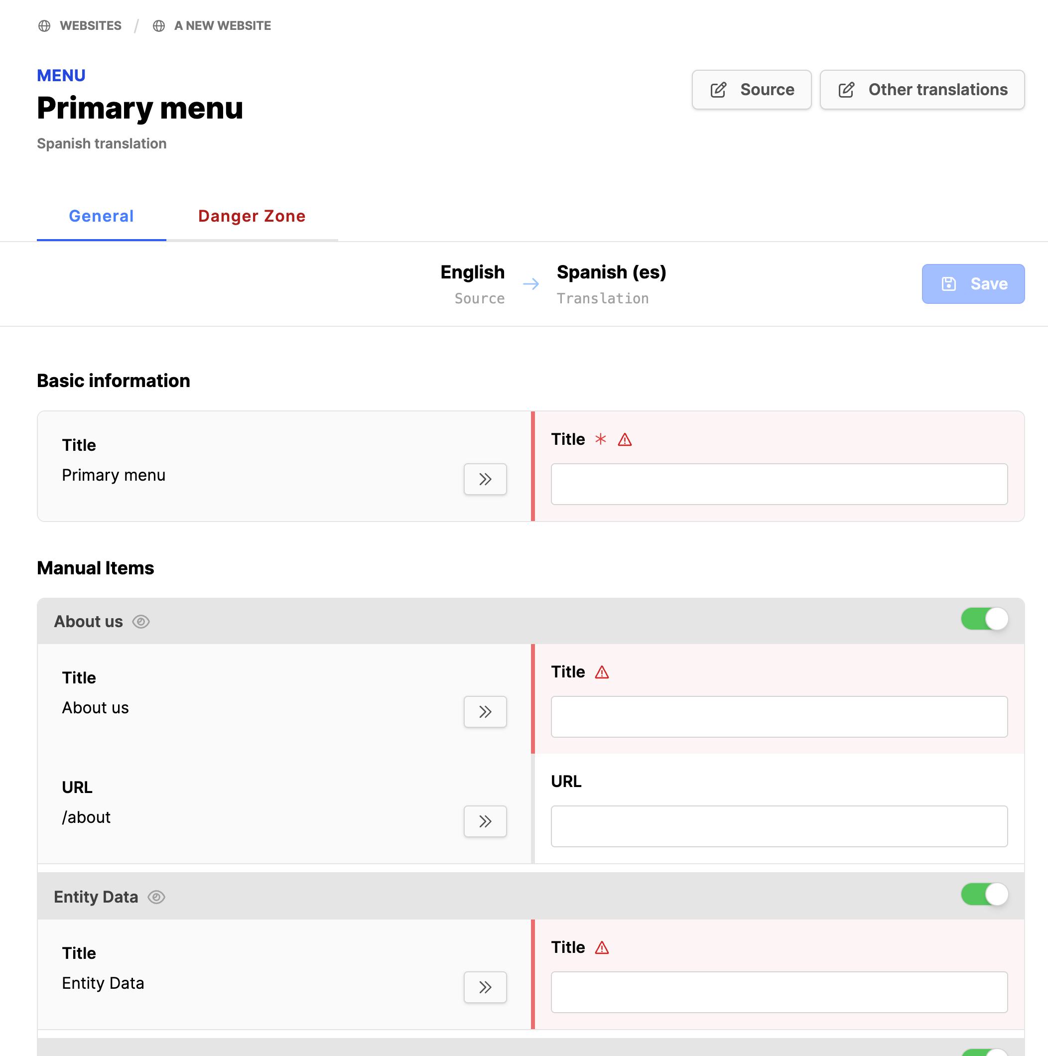 - Click on a Menu title to translate it