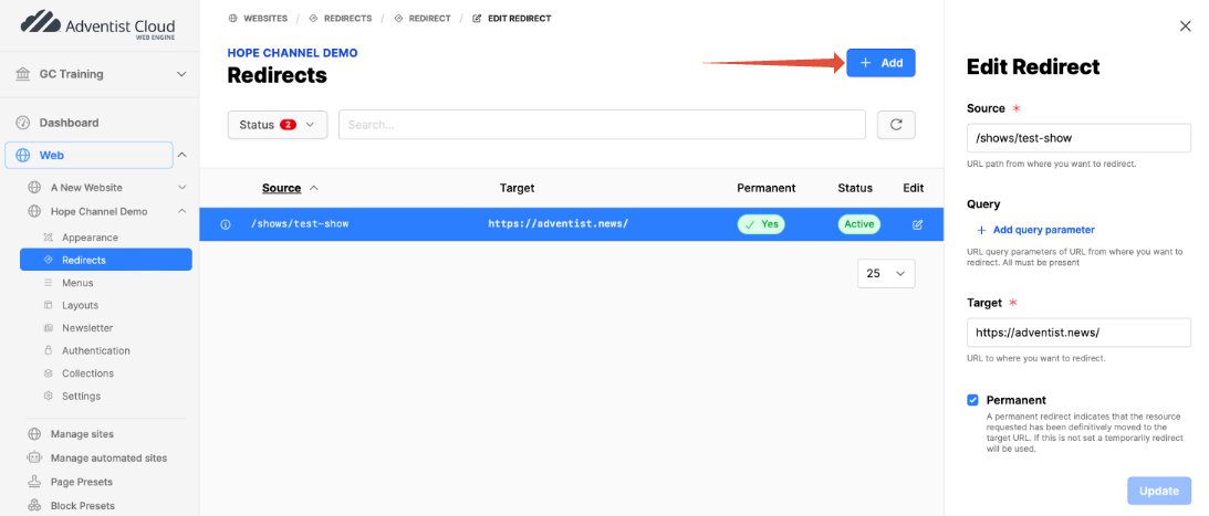 - Note: Please consider the possible paths for the page/show you want to redirect. There may be multiple redirects to add, one per path.
