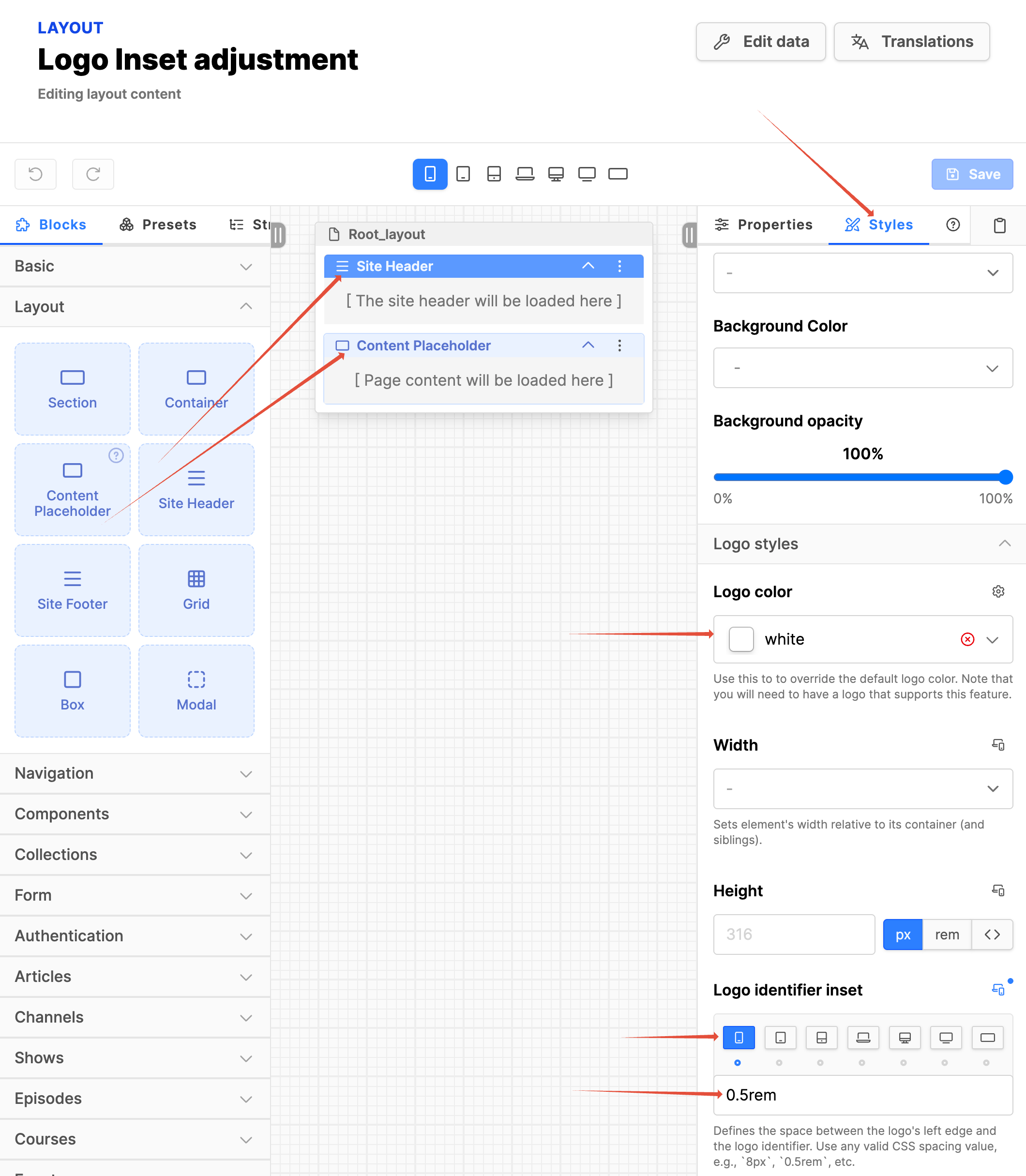 • Note: If your website is already using a custom layout, perhaps to implement the Transparent header, then on the existing custom layout, you can simply make the changes noted above to fix the offset Logo identifier. If the Transparent header is only applied to the homepage, then you will need to create a new Layout as detailed above, and then apply it to the website, so the pages not using the transparent header will have the Logo identifier properly aligned.