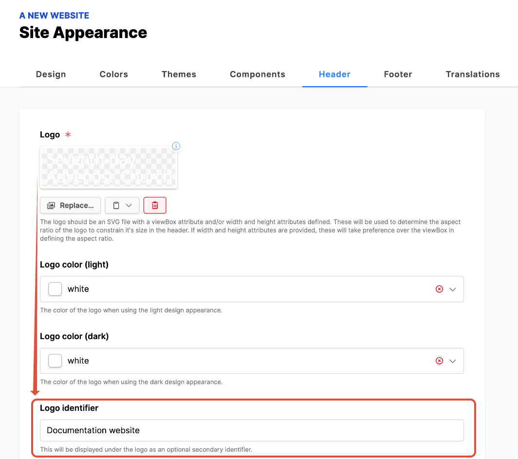 • ! You may need to adjust the color of the Logo identifier. Verify the color of the logo in the frontend and if needed, set the color in the Style color field.